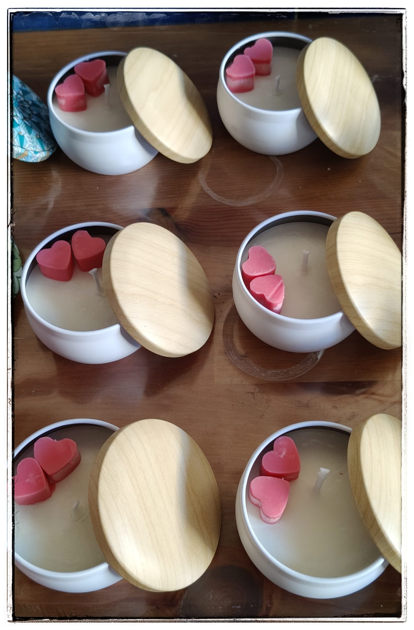 Esta hermosa vela artesanal en lata, que cuenta con una exquisita tapa de madera, está decorada con delicados y encantadores corazones que le aportan un toque especial y único. Esta maravilla del diseño es perfecta para ocasiones especiales, así como para inspirarte a crear. ¡Haz de tu hogar un lugar más acogedor y lleno de amor con esta vela encantadora!