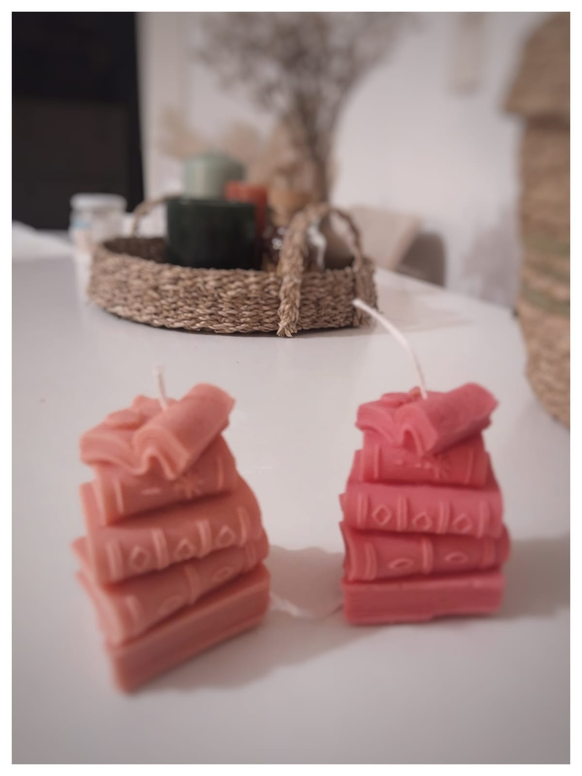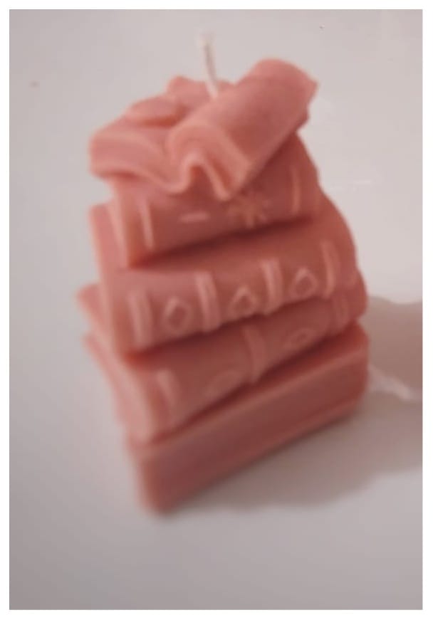 Embellece tu espacio con esta vela decorativa hecha a mano en forma de pila de libros tono coral. Perfecta para amantes de la lectura y la decoración original, ofrece un toque literario y elegante para tu hogar, escritorio o biblioteca. Fabricada con cera de alta calidad y detalles cuidadosamente moldeados, esta vela es ideal como regalo especial.