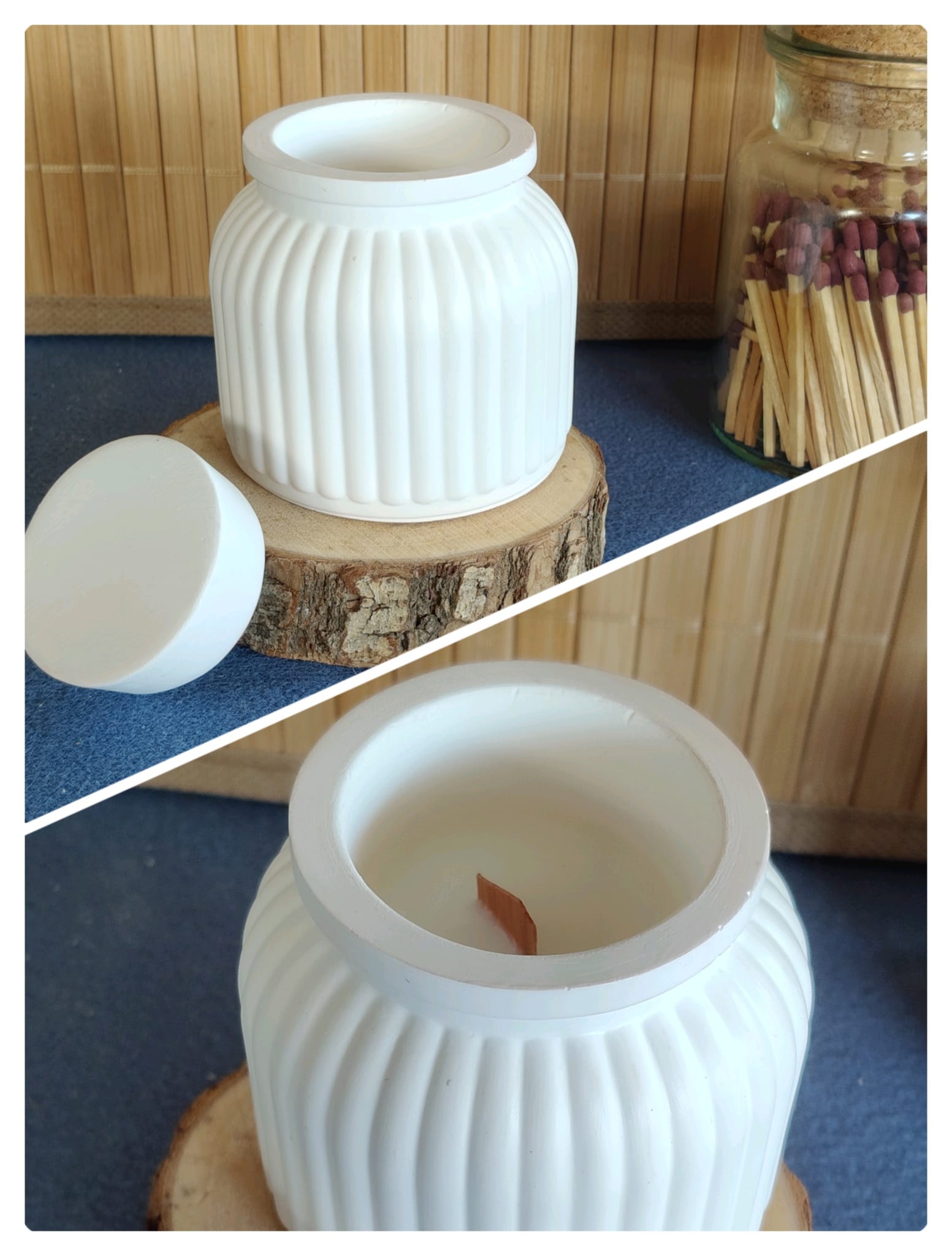Maravillosa vela con mecha de madera en un tarro con tapa de yeso. Su hermoso y elegante diseño aportará un toque de calidez y sofisticación a cualquier entorno, creando una atmósfera acogedora y tranquila. Ideal para esas noches especiales con amigos o simplemente para disfrutar de un momento de serenidad en casa, esta vela se convertirá en un elemento clave en tu decoración. Imagina lo que su luz danzante quiere transmitirte, resguardada en un tarro que realza la belleza de tu hogar y proporciona un calor adicional a tu rutina diaria.